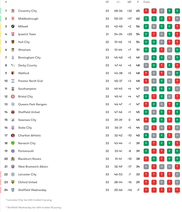 Leicester City snudde 0-1 til 2-1 borte mot Stoke City i helgen. Det så ut til å kunne bli en drømmestart på jobben for Gary Rowett som ledet Leicester for første gang. Dessverre for Rowett og revene utlignet Stoke like før slutt, og dermed endte det uavgjort 2-2. Ett poeng i en slik kamp er for så vidt greit for Leicester med tanke på nåværende form, samtidig som det var en del positive ting å ta med seg fra lørdagens kamp. Problemet for Leicester er at de nå befinner seg i en posisjon hvor de trenger trepoengere så fort som mulig. Etter poengtrekket ligger Leicester nå på nedrykksplass med 33 poeng, og det skiller ett poeng opp til West Bromwich Albion på trygg plass. Situasjonen rundt poengtrekk er fortsatt avklart, og derfor blir det viktig for Leicester å plukke mest mulig poeng fremover. Nå står Leicester med syv kamper på rad uten seier, og mot Stoke var viktige Abdul Fatawu ute. På bortebane har Leicester 4-5-8 denne sesongen, og de har ikke vunnet noen av sine syv siste på fremmed gress.